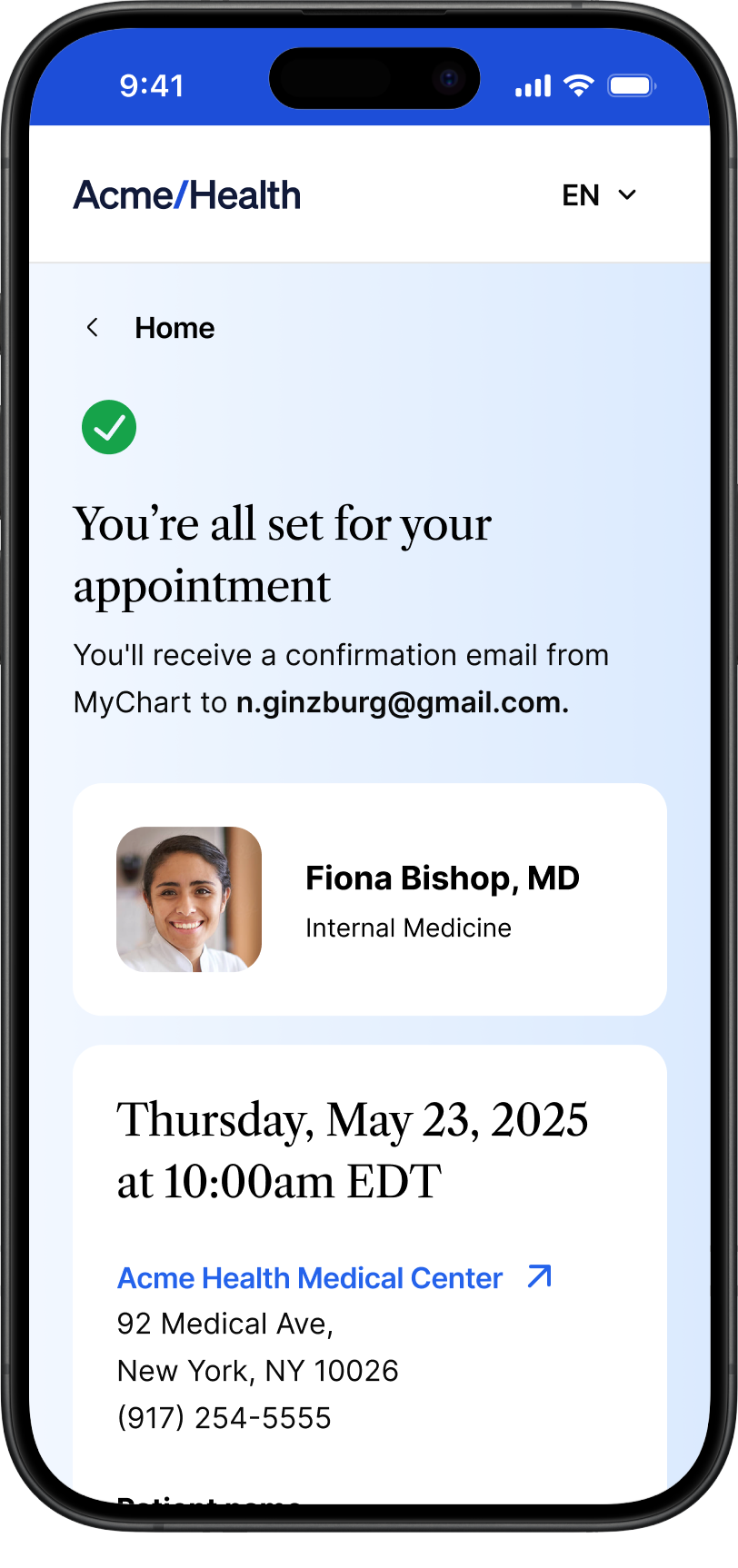 Empower patients to book confidently online, reducing call center load and operational costs.